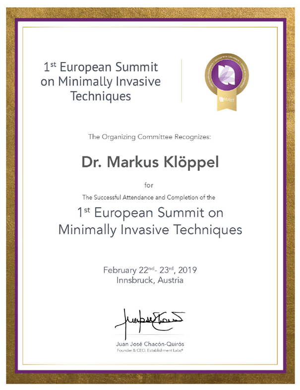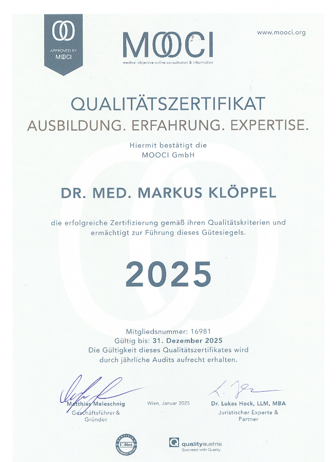 Dr. Klöppel arbeitet nach wie vor eng mit den universitären Forschungsabteilungen zusammen, um sicher zu stellen, dass seine Patienten medizinisch, wissenschaftlich und technisch stets auf höchstem Niveau behandelt werden.