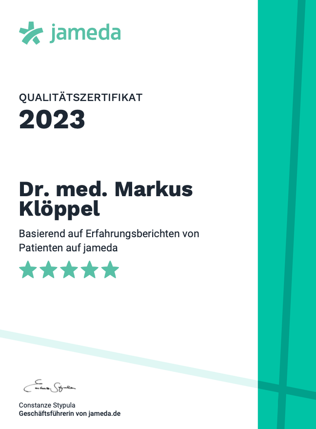 Nach dem Medizinstudium (1983-1989) in Bonn, Berlin und München war Dr. med. Markus Klöppel ab 1990 im Rahmen seiner Promotion wissenschaftlicher Mitarbeiter am Klinikum Rechts der Isar der Technischen Universität München. Dort war er sieben Jahre sehr erfolgreich in der Abteilung für Plastische- und Wiederherstellungschirurgie unter der Leitung des international renommierten Professors Dr. med. E. Biemer tätig. Erfahrung sammelte Dr. Klöppel auch in seiner wissenschaftlichen Arbeit zur Steigerung der Gefäßneubildung in Körpergewebe, Haut und Muskeln. In diesem Zusammenhang erhielt er ein mehrjähriges Forschungsstipendium der Deutschen Forschungsgemeinschaft DFG und zahlreiche wissenschaftliche Auszeichnungen und Preise. Studienaufenthalte an der Harvard Medical School (Boston, Massachusetts), dem Groote Schuur Hospital (University of Cape Town, South Africa) und vielen anderen Institutionen rundeten seine Ausbildung ab.