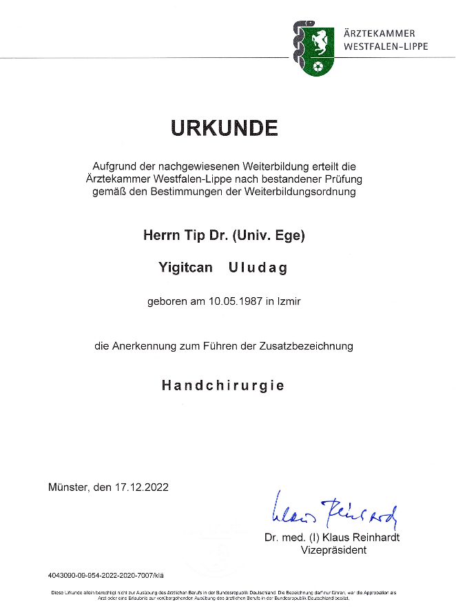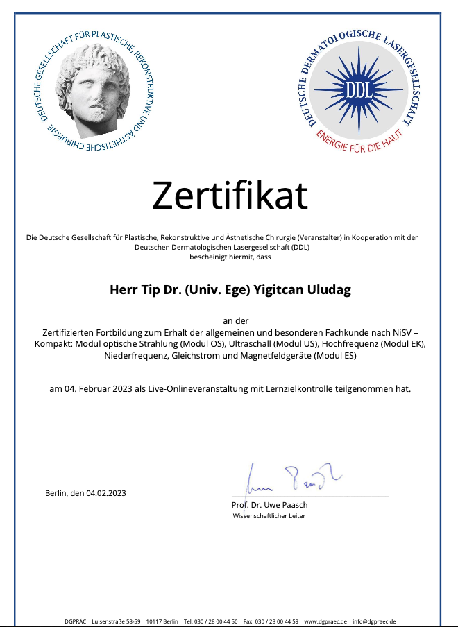 Von 2005 bis 2012 absolvierte Dr. Yigitcan Uludag sein Studium an der Medizinischen Fakultät der Universität Porto (Portugal) sowie an der Medizinischen Fakultät der Ägäis Universität Izmir (Türkei), wo er 2012 auch promovierte.